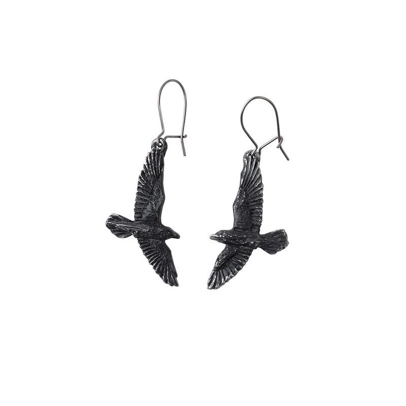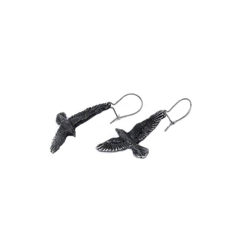 A pair of small, black pewter raven droppers on surgical steel ear-wires.