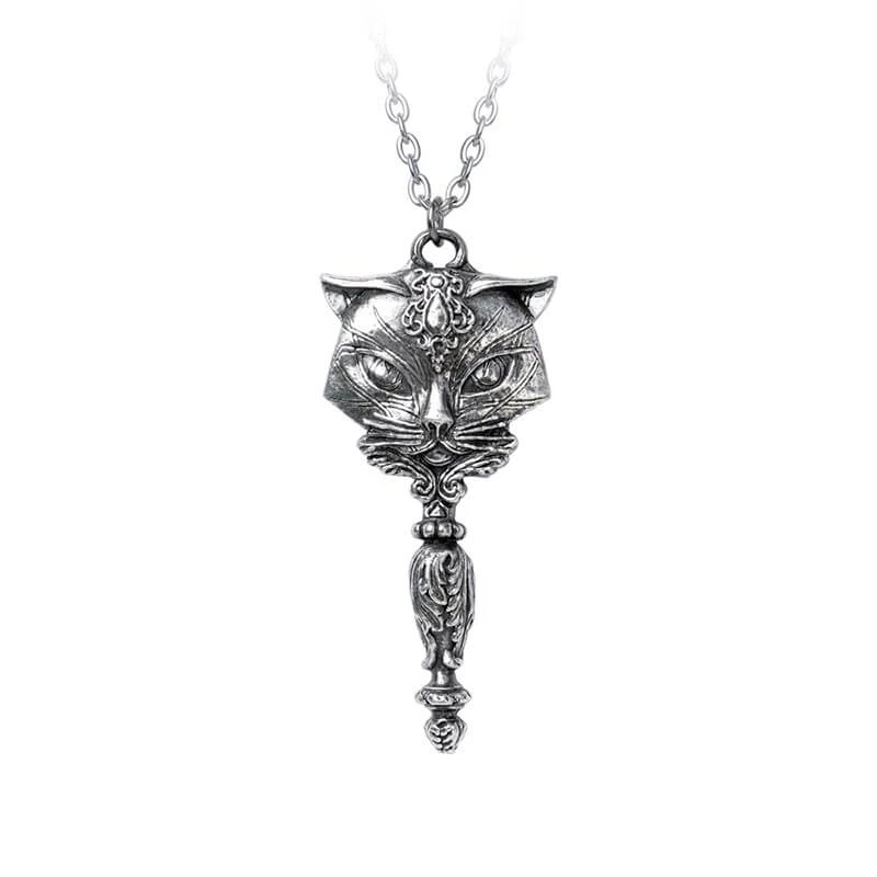 A miniature, highly ornamental pewter hand mirror pendant, 3′ (75mm) long, in the form of the stylized face of a cat.