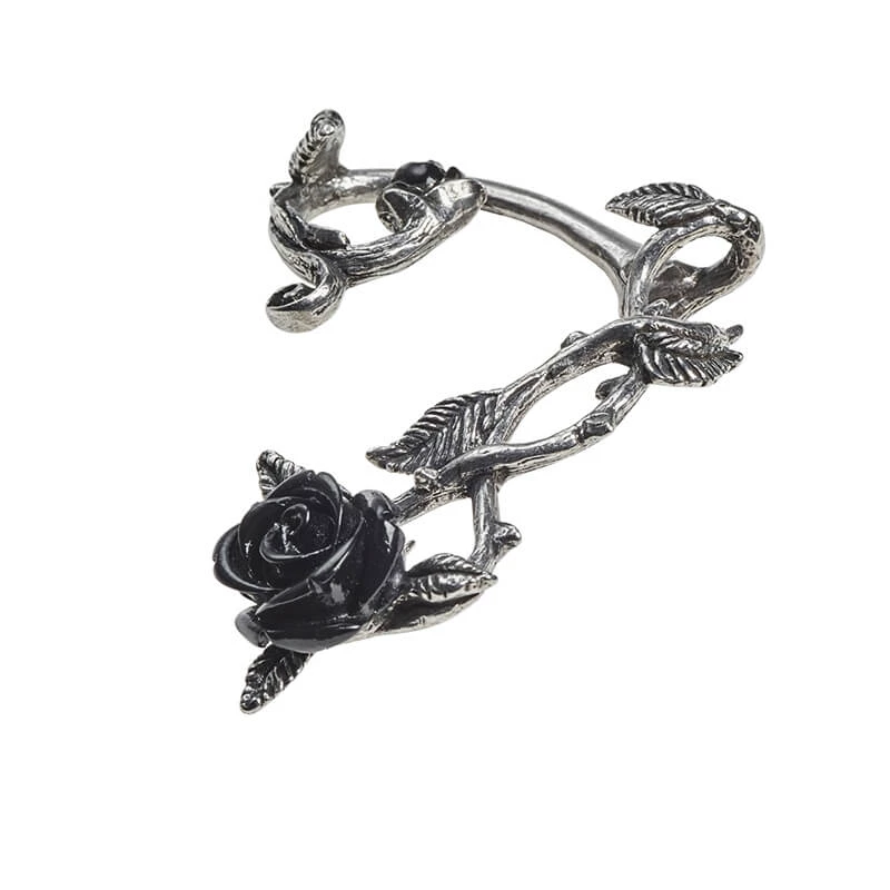 A polished pewter twine of wild roses wrapping around the ear, with black resin rose at the foot; surgical steel ear-post. For the left ear.
