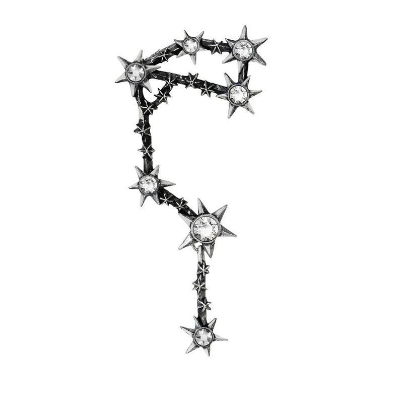 A pewter earwrap depicting the stellar constellation of the Pleiades, with seven Swarovski crystals representing the stars including the final one, Atlas, suspended on a dropper.