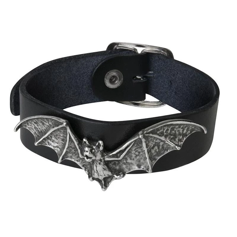The consummate metaphor to capture that dark, mysterious and dangerous creature that stalks the night in search of exotic sustenance. A narrow black leather wrist strap with a buckle fastening and fitted with a dark pewter bat, in full flight.