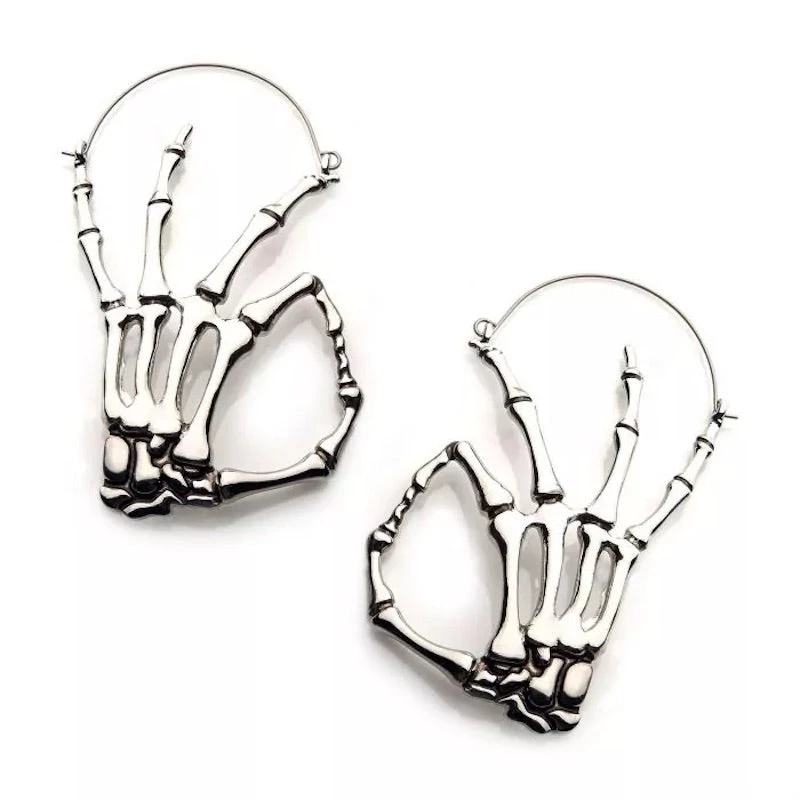 20g Stainless Steel Post Skeleton Hands Embrace Plug-Friendly Hoops. Sold as Pair. Plug Hoops were designed to fit comfortably in any flesh tunnel style of body jewelry worn in the earlobe. The post is made from Stainless Steel and can be worn as a normal ear piercing.