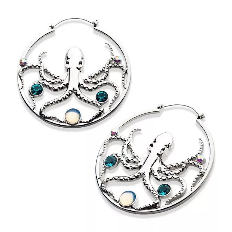 20g Stainless Steel and Silver Plated Opalite Octopus Plug-Friendly Hoops. Plug Hoops were designed to fit comfortably in any flesh tunnel style of body jewelry worn in the earlobe. The post is made from Steel and can be worn as a normal ear piercing. Sold as a Pair.