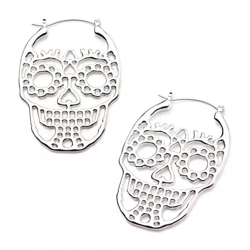 20g Surgical Steel Silver casted Sugar Skull Plug-Friendly Hoops. Plug Hoops were designed to fit comfortably in any flesh tunnel style of body jewelry worn in the earlobe. The post is made from 316L and can be worn as a normal ear piercing. Sold as a Pair.