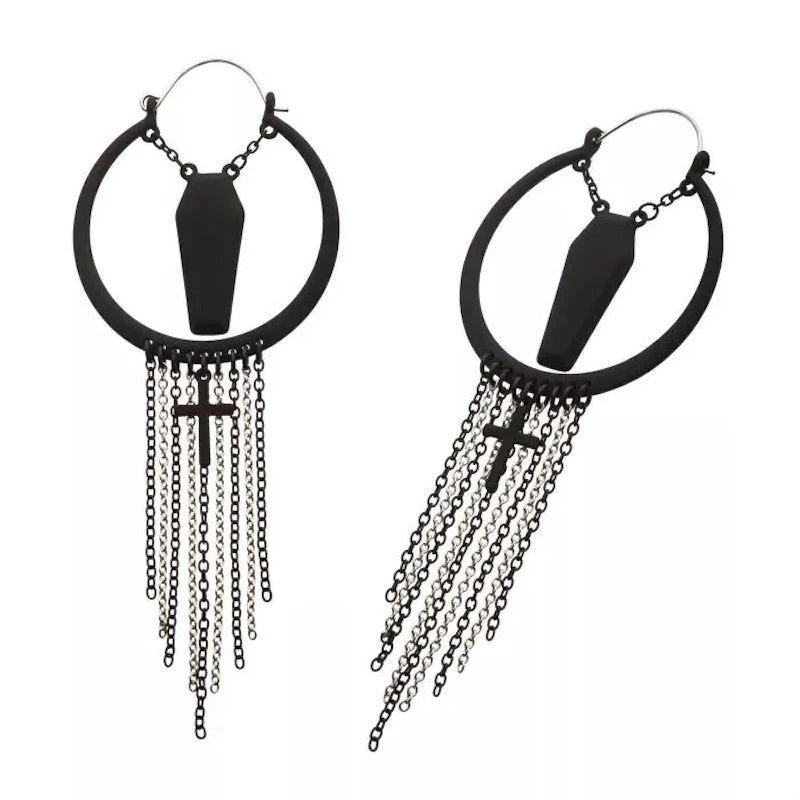 20g Matte Black Plated Coffin Cut-Out Plug-Friendly Hoops. Plug Hoops were designed to fit comfortably in any flesh tunnel style of body jewelry worn in the earlobe. The post is made from Stainless Steel and can be worn as a normal ear piercing.