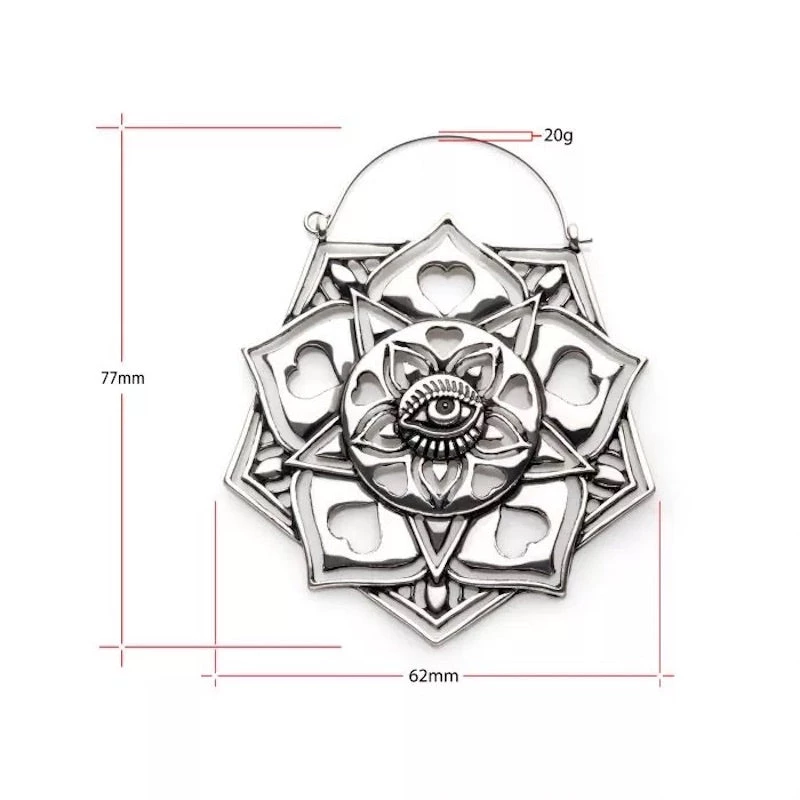 20g Stainless Steel and Silver Plated Mandala Plug-Friendly Hoops. Plug Hoops were designed to fit comfortably in any flesh tunnel style of body jewelry worn in the earlobe. The post is made from Steel and can be worn as a normal ear piercing. Sold as a Pair.