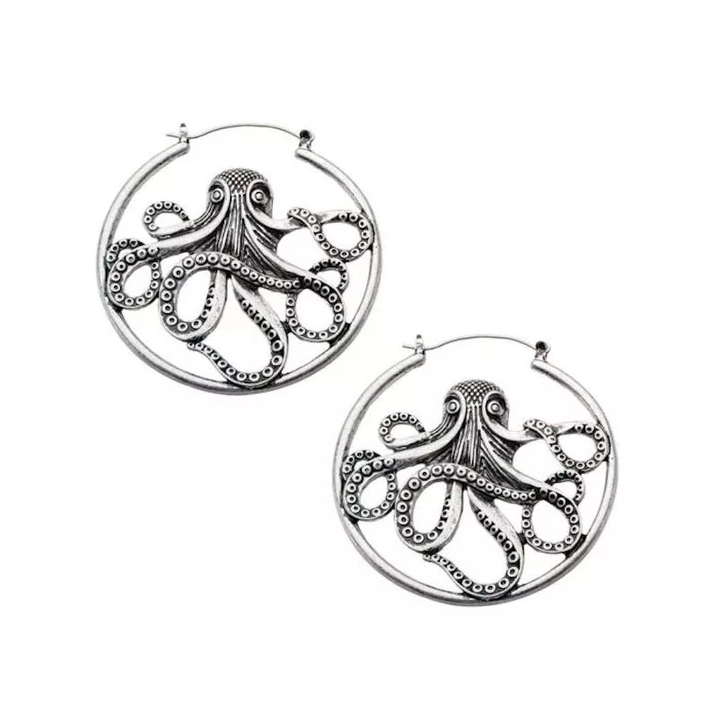 20g Stainless Steel and Silver Plated Octopus Plug-Friendly Hoops. Plug Hoops were designed to fit comfortably in any flesh tunnel style of body jewelry worn in the earlobe. The post is made from Steel and can be worn as a normal ear piercing. Sold as a Pair.