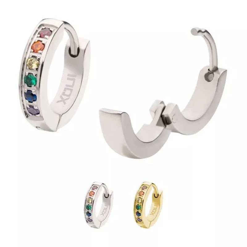 Stainless Steel Prong Set 1.5mm Rainbow Round CZ Huggie Earrings. Sold As pair. Available in Steel and 18k Gold Plated.
