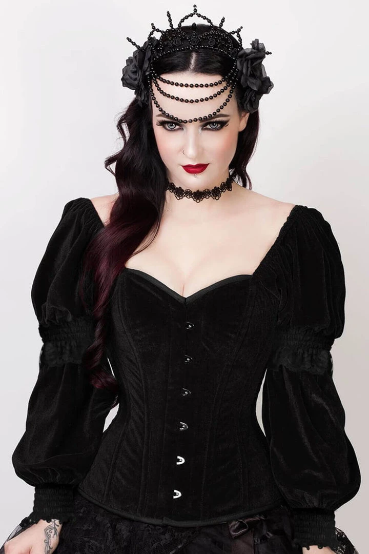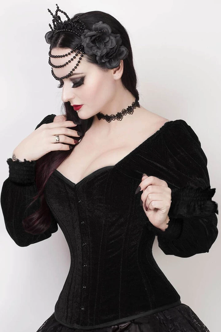 Our Velvet VictorianPuff Sleeved overbust corset is an amazing homage to the classic victorian look with a slightly modern twist to it. The velvet printed fabric is just a small but noticeable change to this classic look. The sleeves allow for an effortless look that will surely turn heads. Perfect with a skirt or pants rock this beauty and people won’t be able to resist your allure.