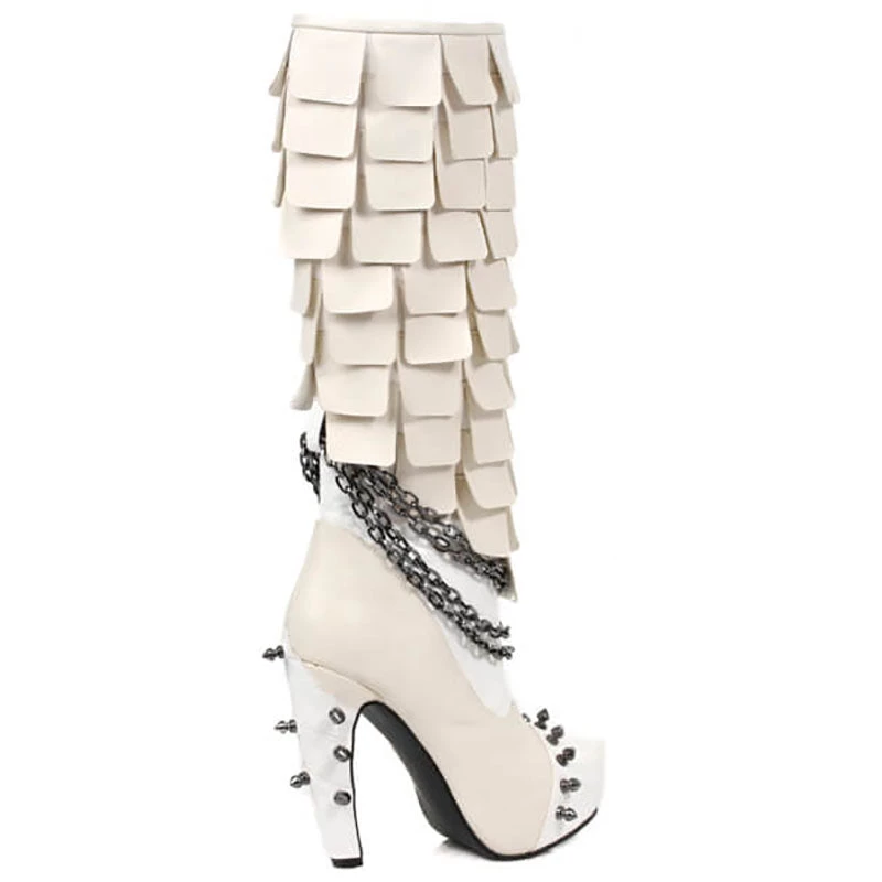 - Custom cut scale like flaps on the upper portion of the boots with matching metal chains around the ankle.