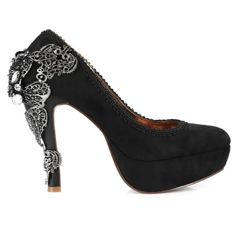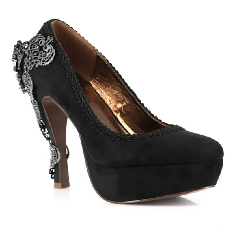 This a elegant Victorian influenced closed toe high heel with a slash of sparkle and dazzle.