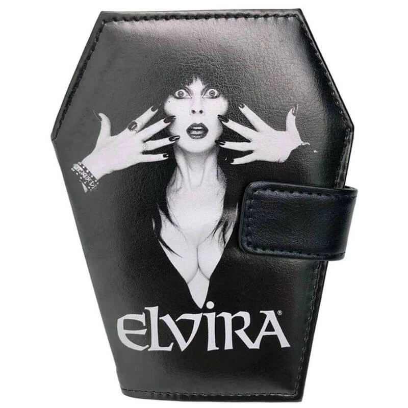 Kreepsville official Elvira Mistress of the Dark coffin wallet, printed Elvira classic hands photo with snap fastener, ID, cards and note sections with eyelet for wallet chain