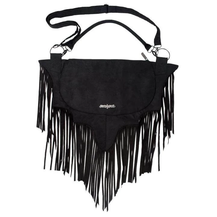 Kreepsville 666 batwing fringe shoulder purse bag with detachable chain detail shoulder strap. Also includes a detachable and adjustable long shoulder strap to turn instantly into cross-body purse bag. Made from vegan suede. Kreepsville 666 grey and black lining, inside pockets with Kreepsville 666 logo badge on the front and a 9-inch fringe.