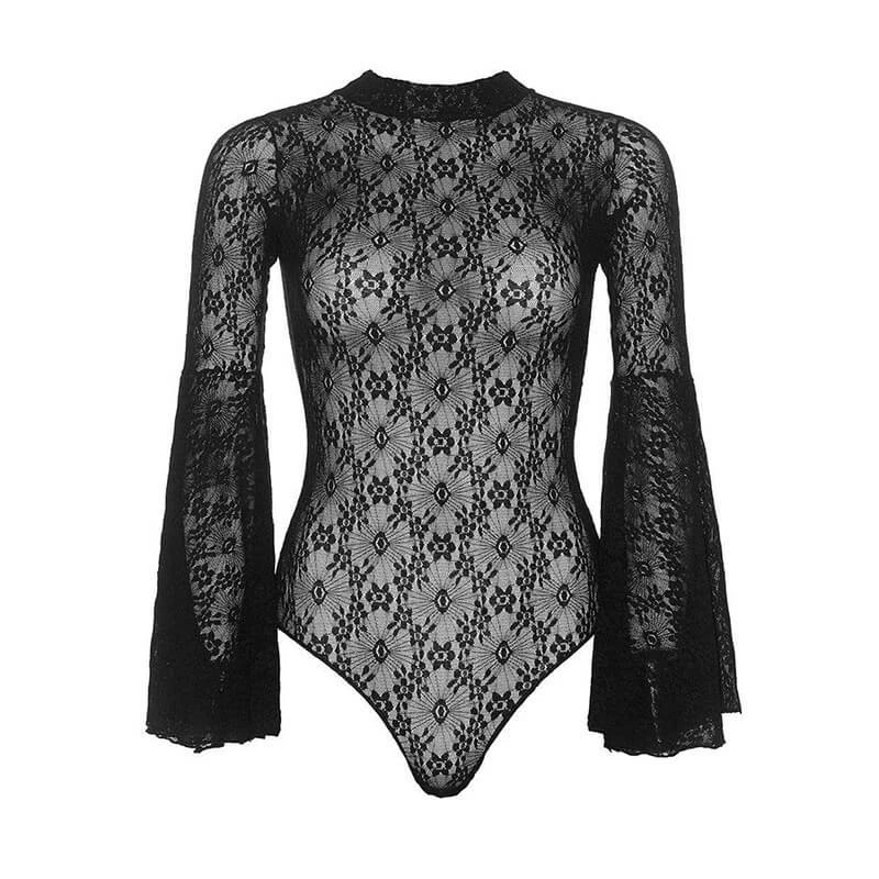 A classic silhouette with rock star flair, this high neck lace bodysuit features a keyhole back, snap crotch thong panty, and bell sleeves. Perfect as an everyday laying piece or for festival looks!