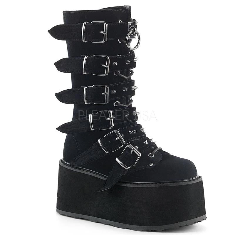 - 3 1/2″ (90mm) Platform Lace-Up Front Mid-Calf Boot Featuring 6 Cone-Studded Buckle Straps