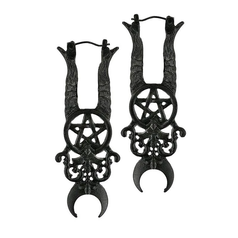 These gloomy earrings would be amazing addition for your gothic jewelry collection! These earrings feature are devil horns, pentagram symbol and moon crescent, all combined into a uniquely detailed presentation. Made of hard but light metal alloy with black patina. Made of black mat metal, with old-fashioned texture.