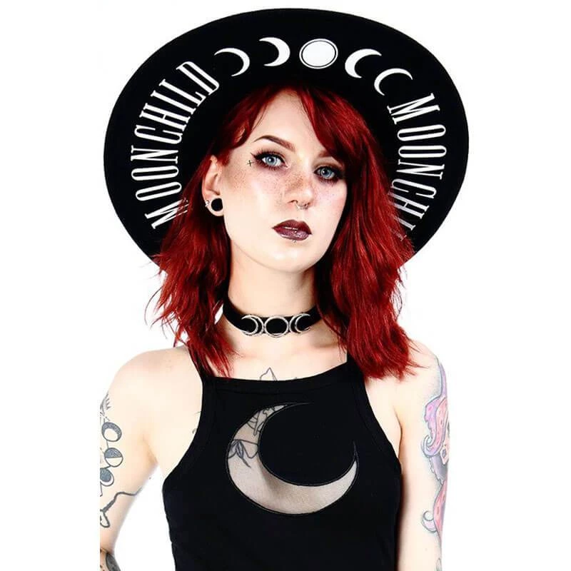 Our Moon Child Wide brim hat is a sexy and fun staple accessory that every lunar vixen should own! This hat is sure to take any outfit to the next level of darkness and is a fun way to add that witchy look for a night out bewitching the town!
