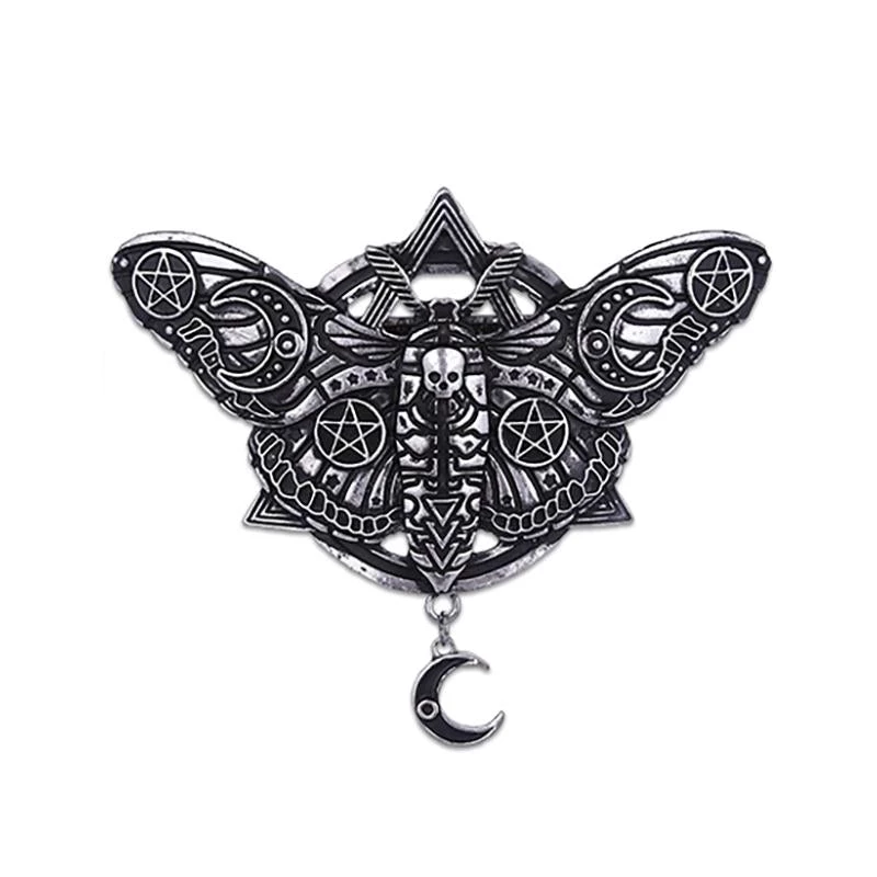 Occult Moth Hair Clip adorned with occult symbols pentagram, moon, skull and geometry. Black parts are filled with matte mass, which contrasting beautifully with rest of the silver hair clip.