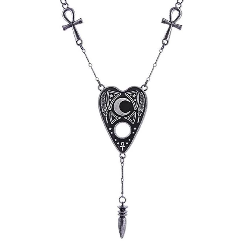 Cursor is filled with black, matte mass, which contrasts beautifully with the silver symbols. Above, there are ankh crosses attached and below is hanging karnak pendulum, all connected by chains.