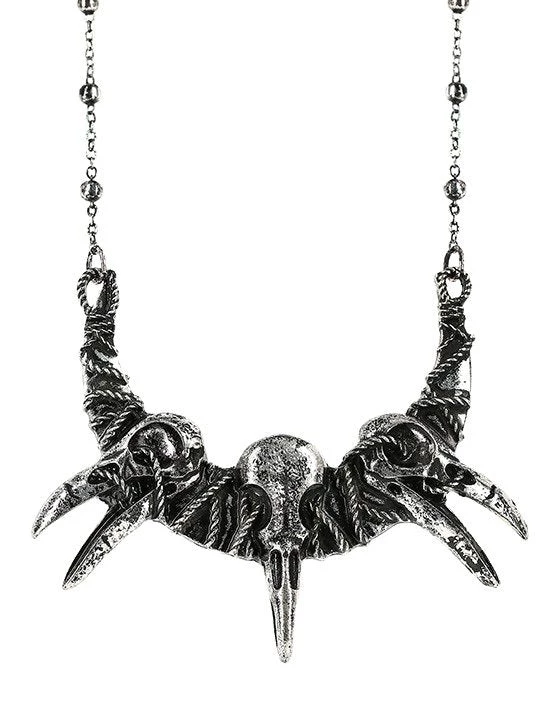 This Raven Skulls Necklace is to die for! Raven skulls are a sign of strength and passion, we know you have both but do they! Rock this sexy necklace with any outfit! This necklace features three raven skulls nested in a silver rope entwined design!