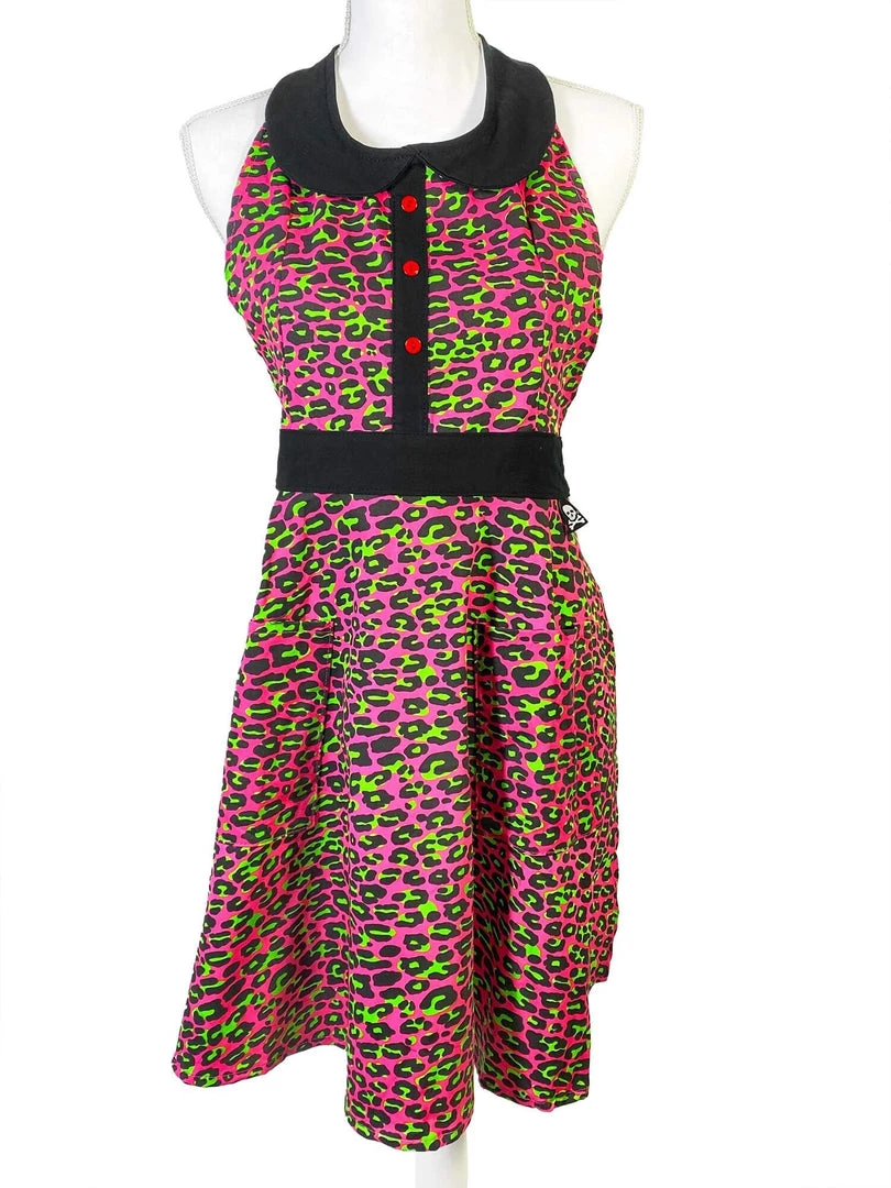 Finally, the perfect apron for all the punk rock kittens out there that like to cook. Blast some Lunachicks and make a soufflé! This cotton apron is in a bright pink leopard with pops of neon green, contrast red button detail, and then trimmed in black. We’ve added pockets to hold your phone or recipes!