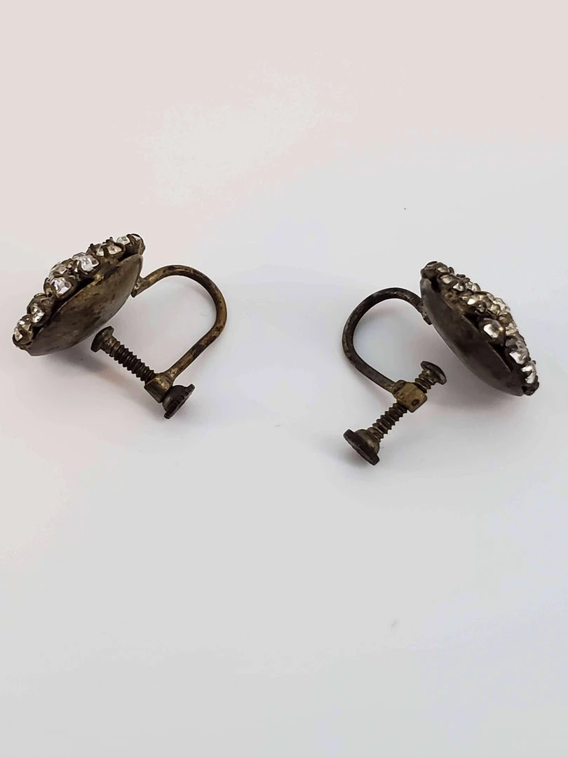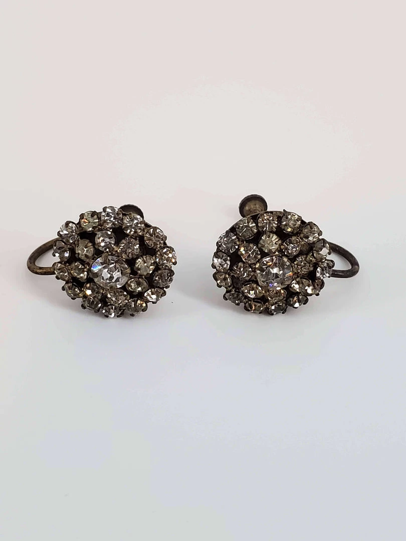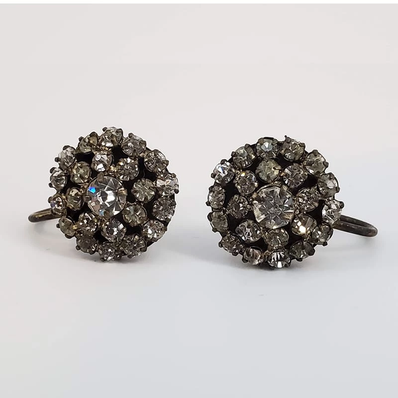 Truly glamorous vintage rhinestones in round flower pattern. Adjustable clip on backings. These earrings really shine! Condition is good with some tarnish on the back. Not mising any stones, amazing vintage find! Measure approx. .5″ each.