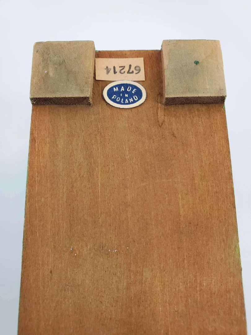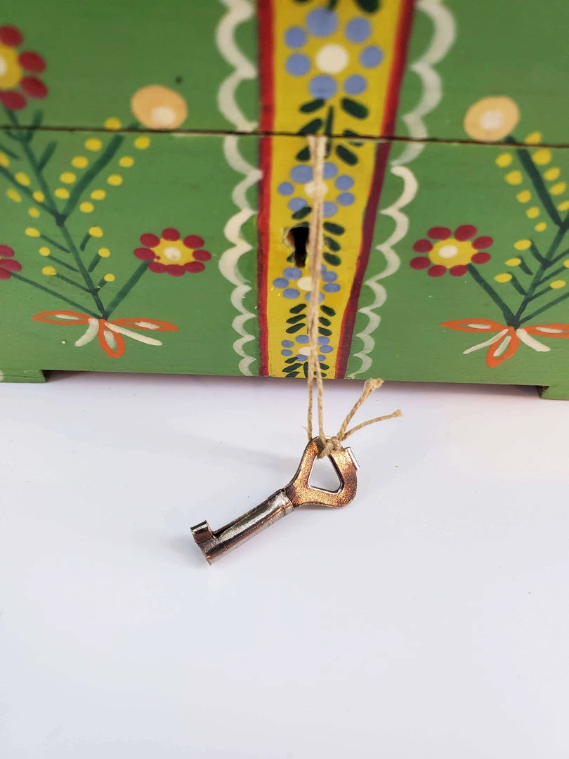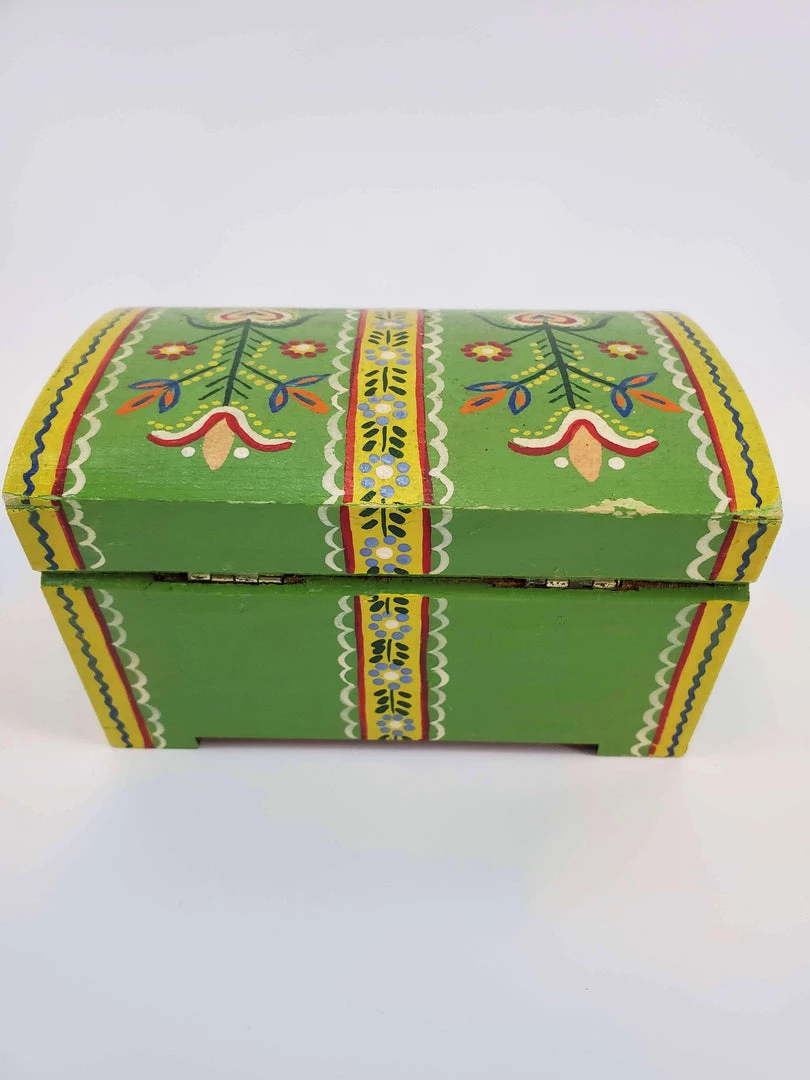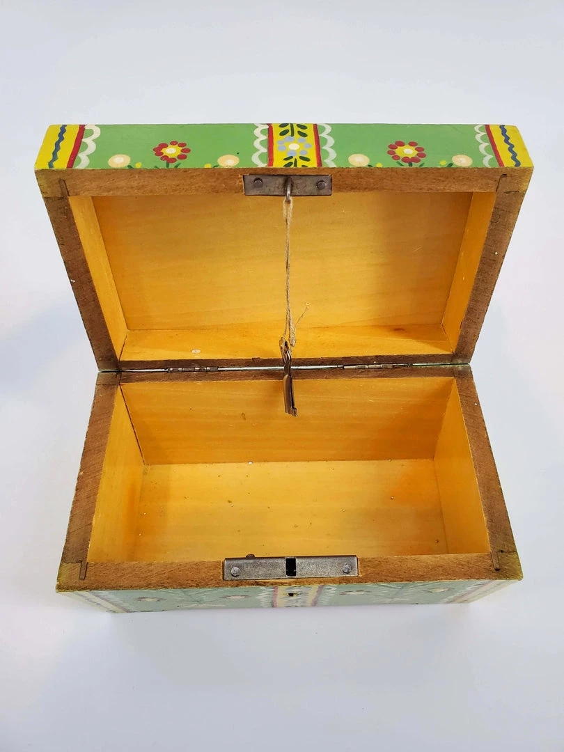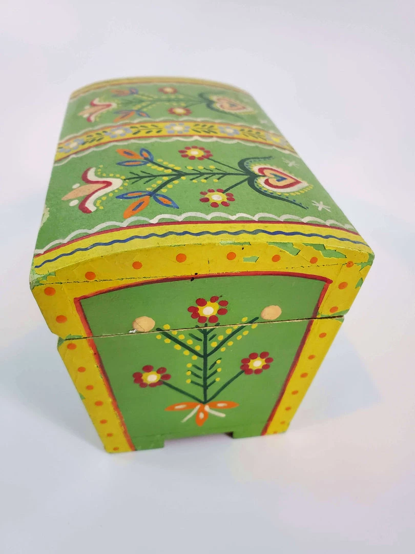Very lovely hand painted box with floweres and hearts on green background. Comes with key. Locking mechanism works great with key. Says Made in Poland on the bottom. Condition is good with slight wear and chip on rear lid. Amazing statement piece to brighten your room. Measures approx. 5.4″L x 3.3″W x 3.2″H