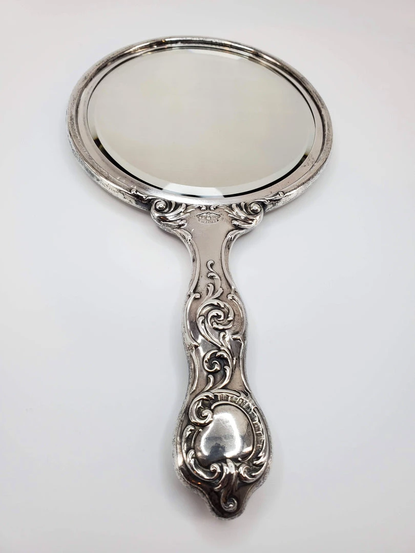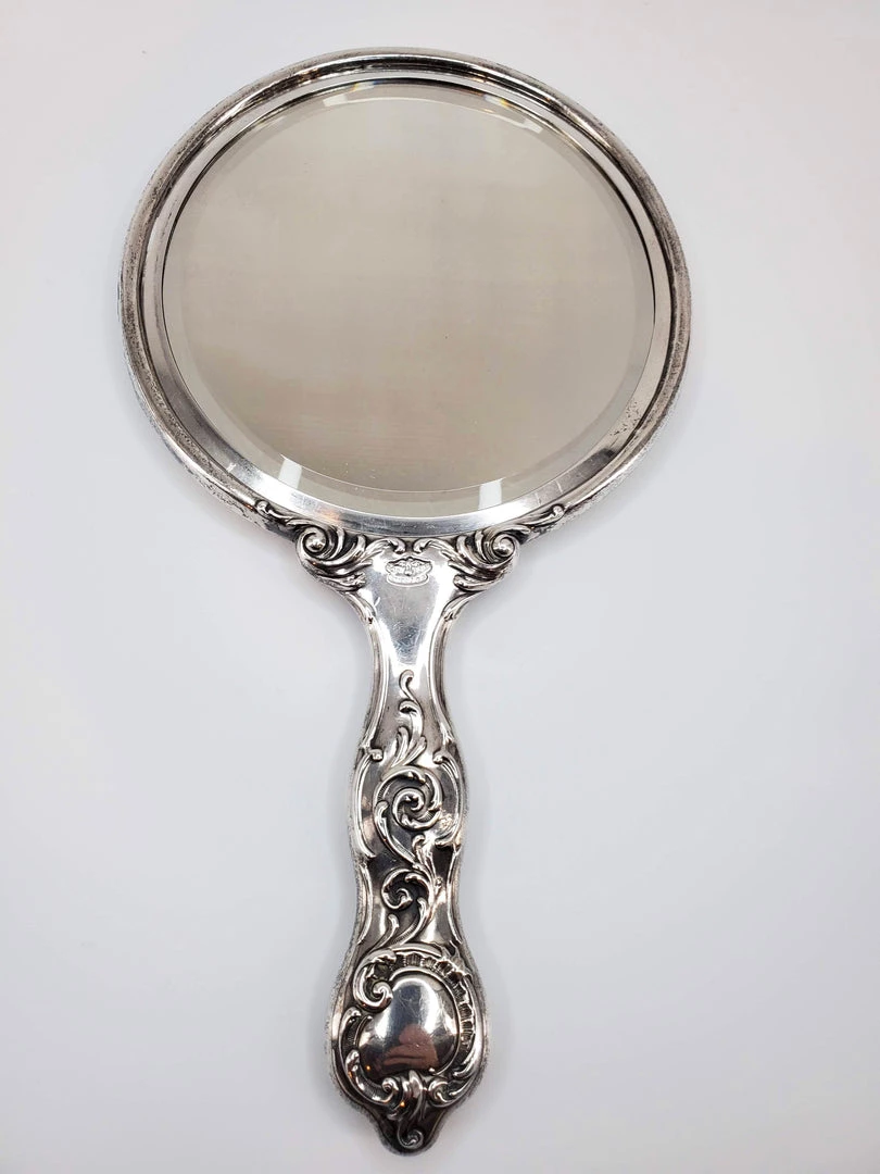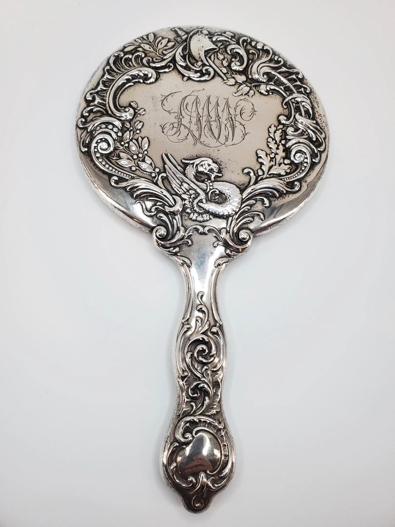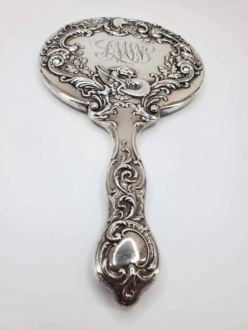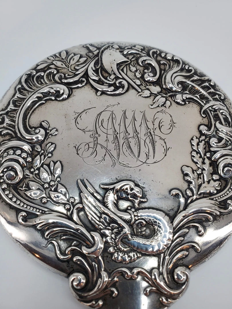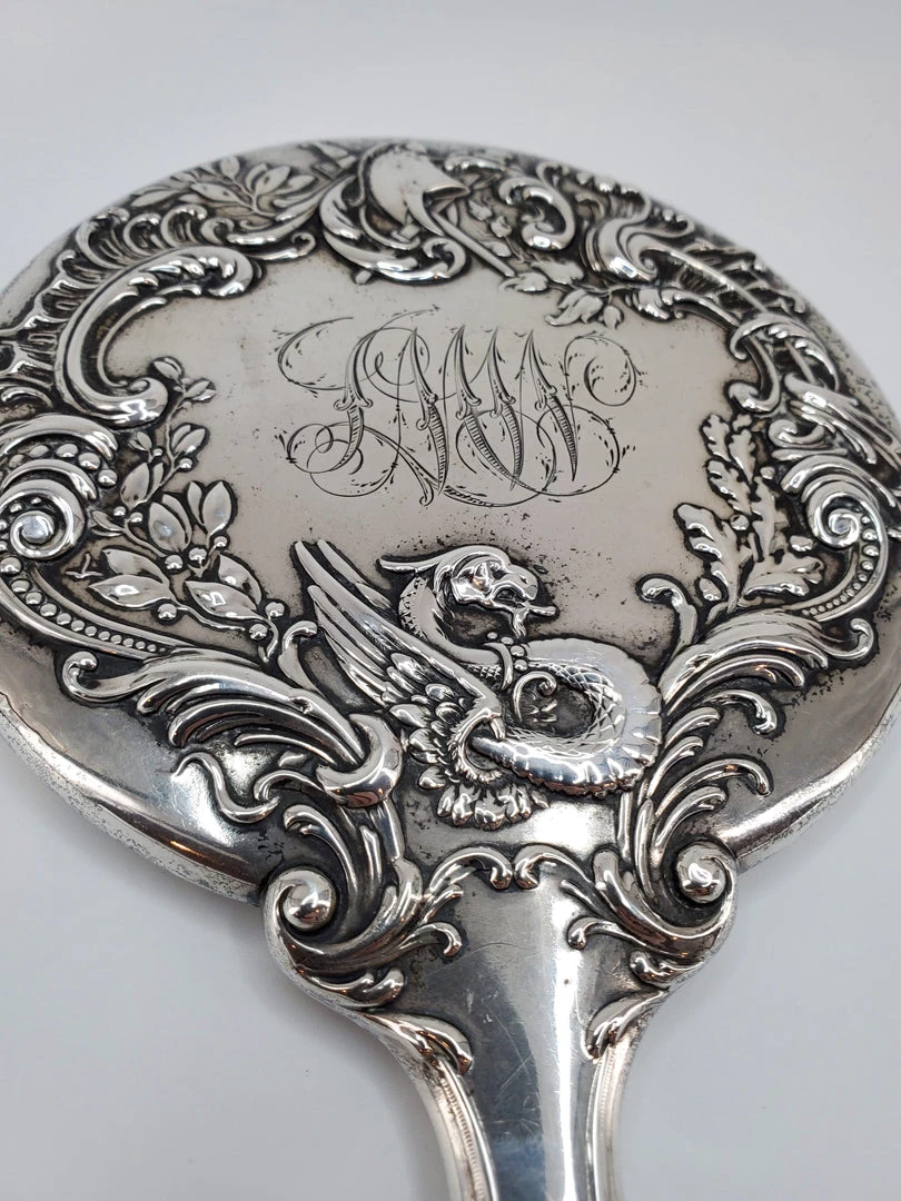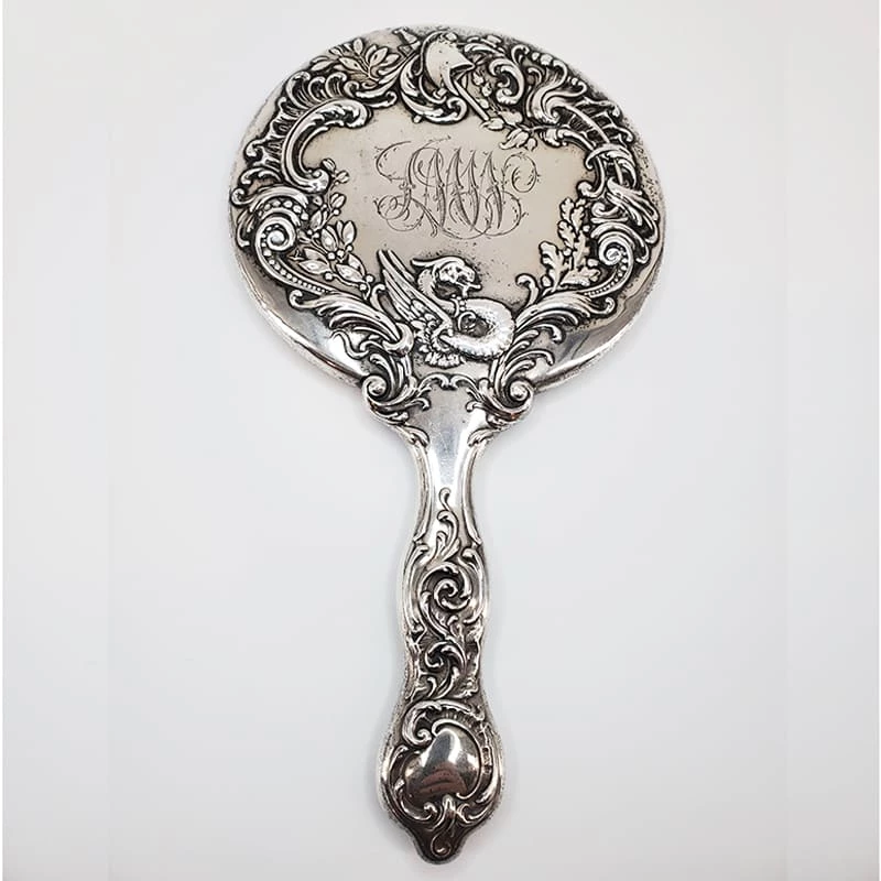 Real silver vinage hand mirror with gorgeous ornate dragon and sword design and beveled mirror. Condition is good with some tarnish. Measures – 5.5″W x 9.5″H