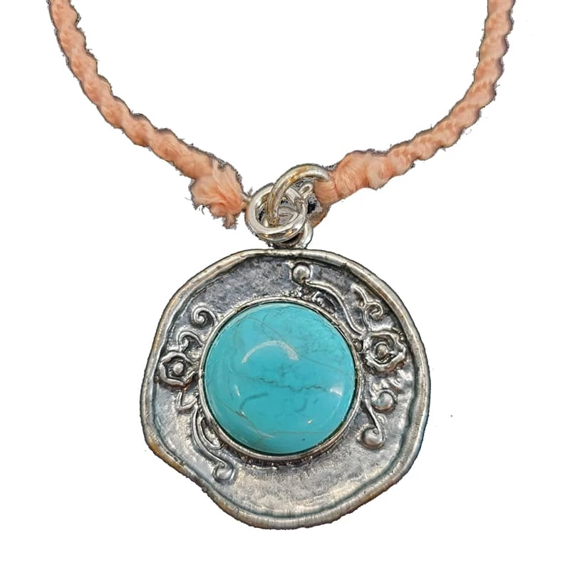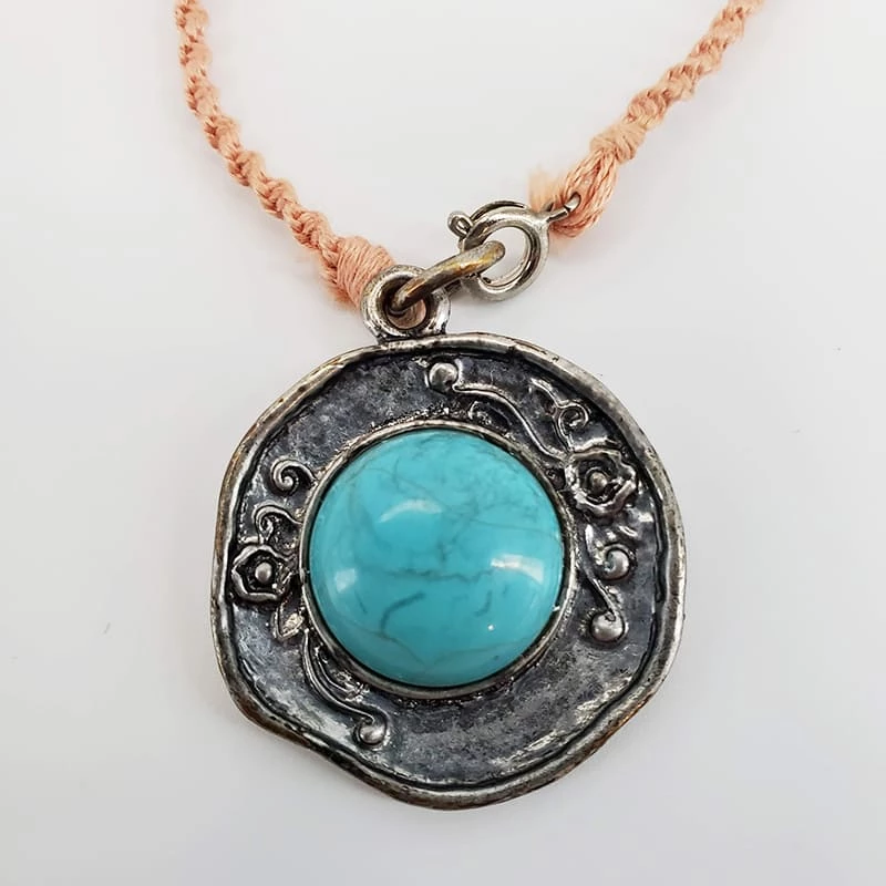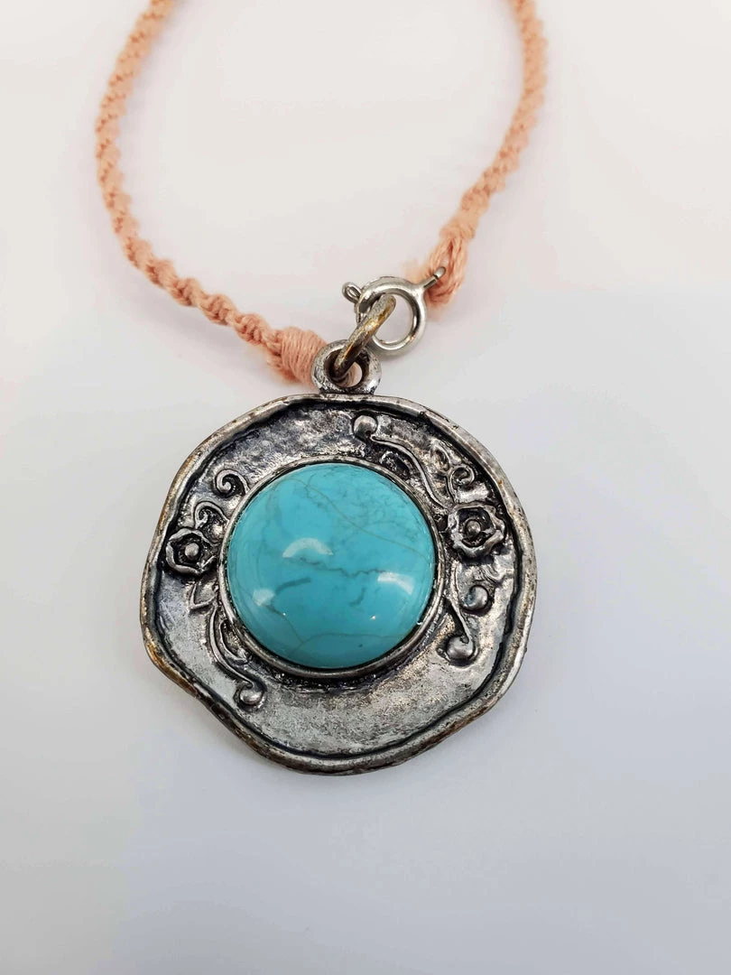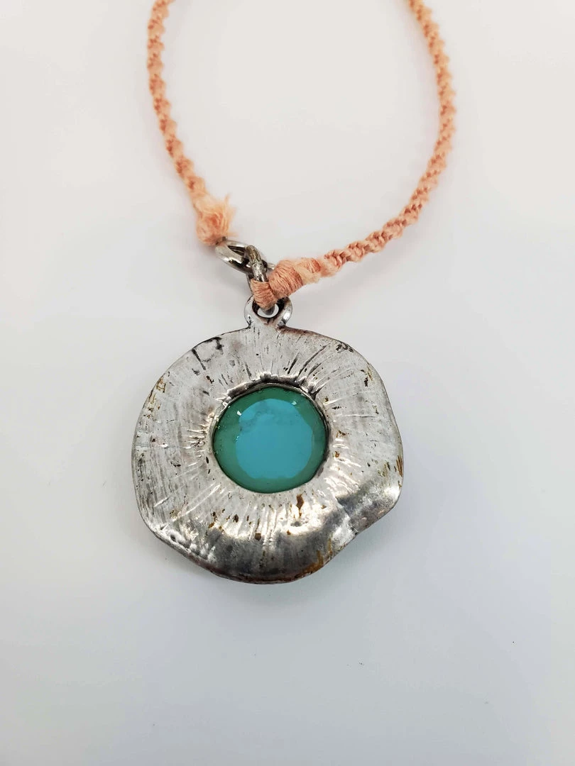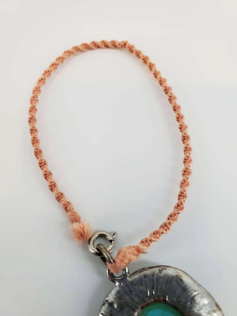 Your good luck charm! Design appears to be hammered into this coin shaped pendant with a gorgeous aquamarine stone at its center. Nice woven rope attached to possibly wear as a bracelet. Condition is very good. Measures approx. 4.5″L total.