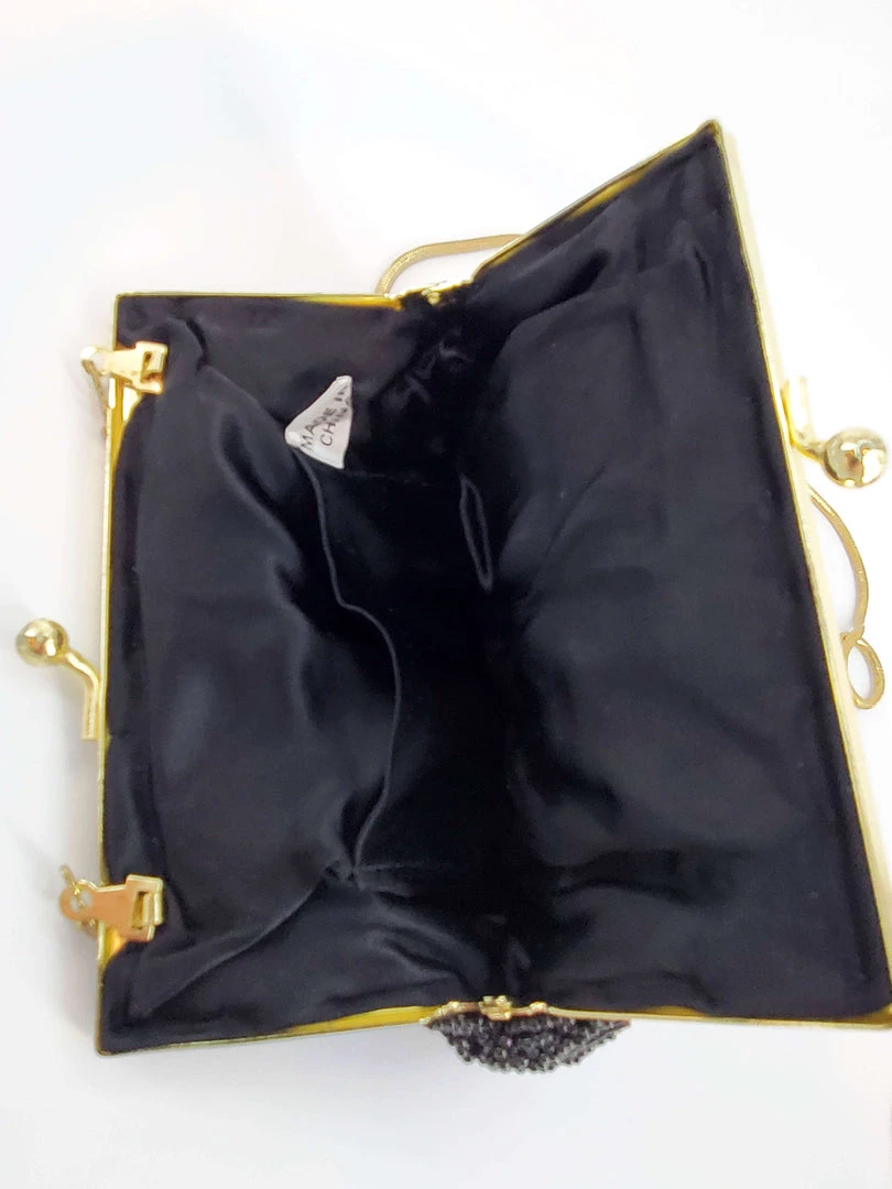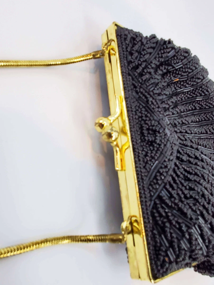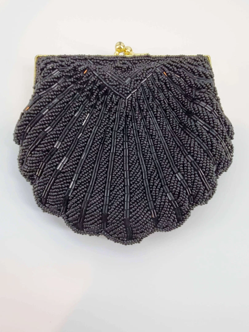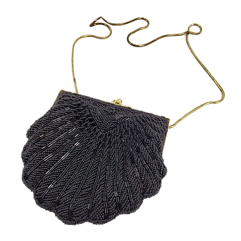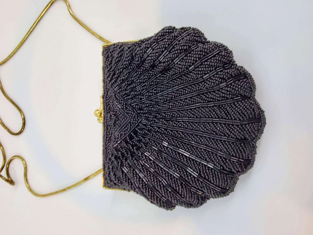 SKU: violet-s-coffre-6702344372326 Categories: Accessories, Bags and Purses, Purses, Vintage Tags: Beaded, Black, Chain, Clutch, Gold, Purse, Shell