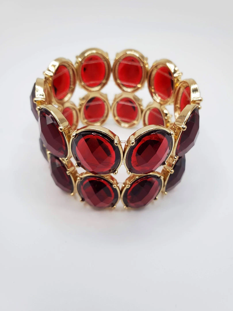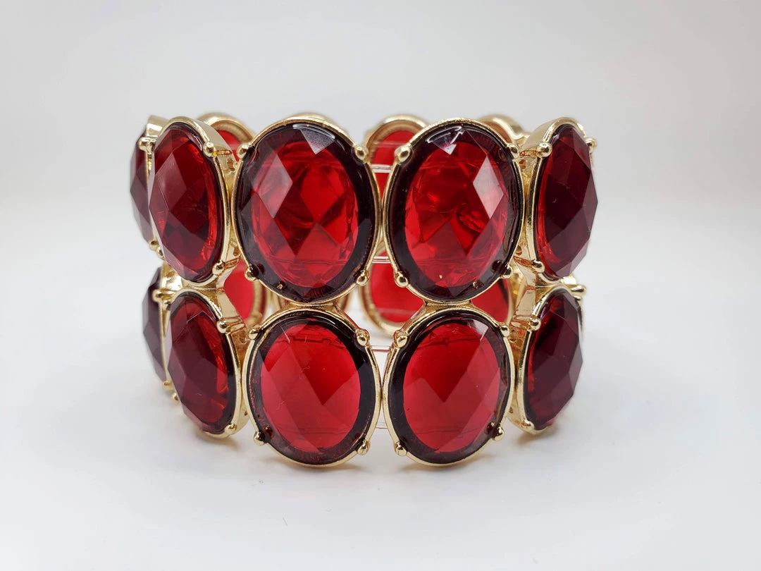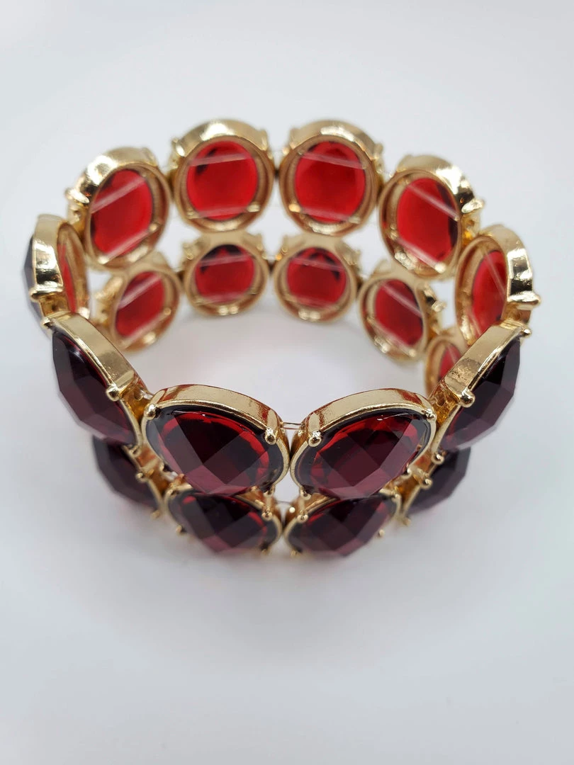 Stunning vintage gold and ruby colored cuff bracelet with 20 large cut glass gems. Condition is good. Measures 3.3″W x 1.8″H