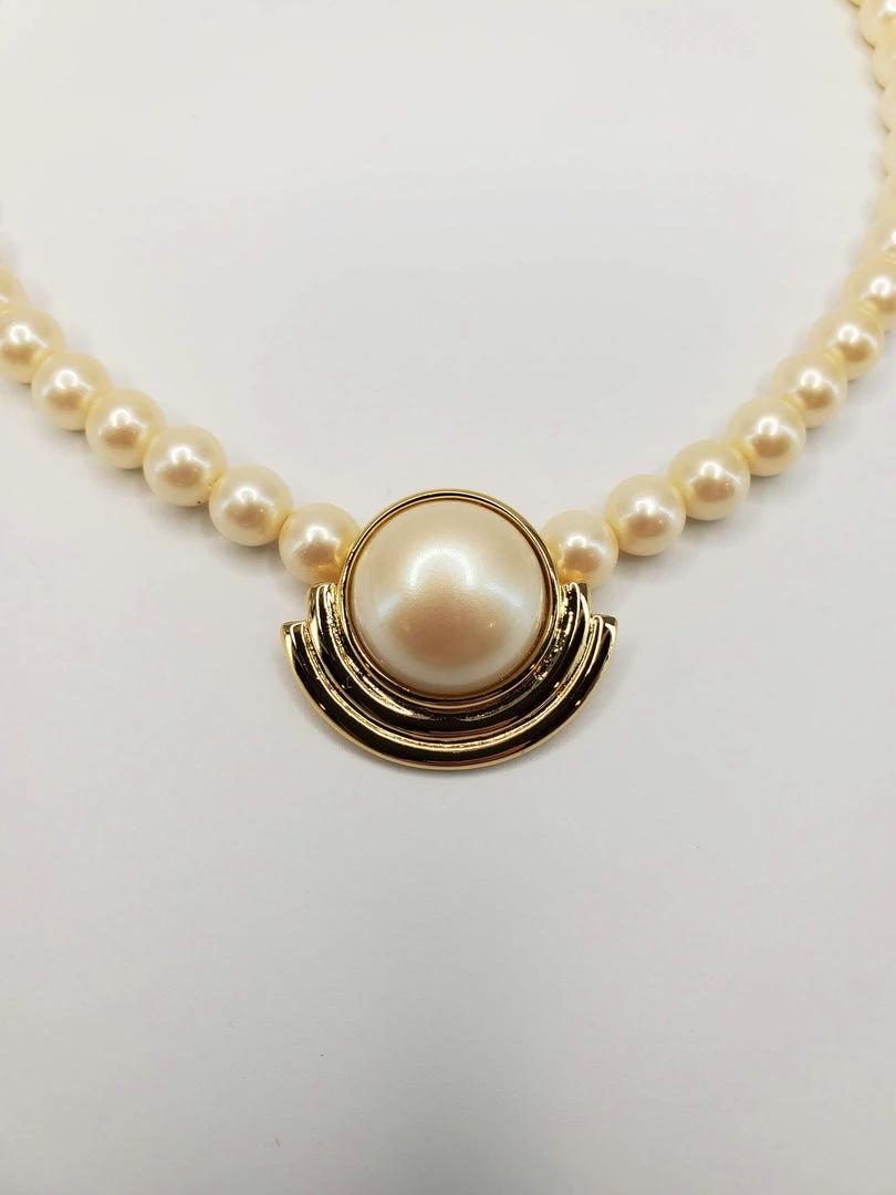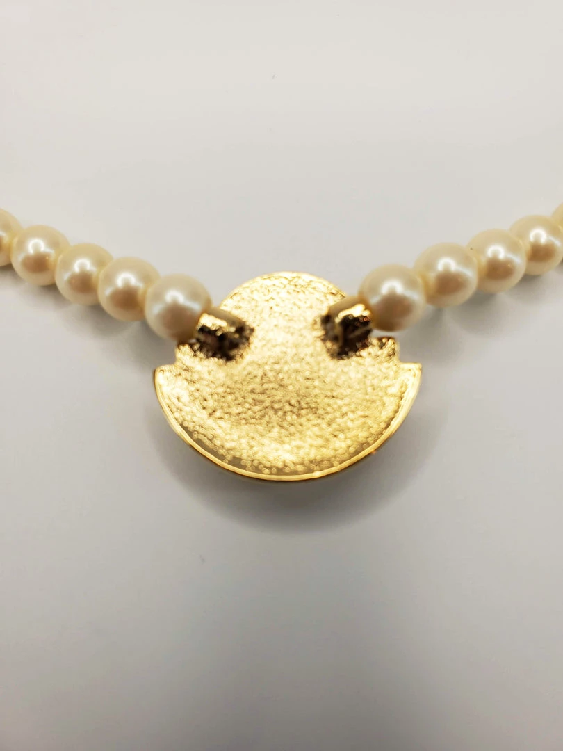 Lovely art deco pearl choker with giant gold tone and pearl pendant. Condition is good. Measures approx. 8.5″ L.