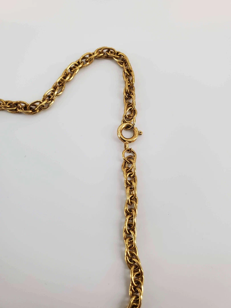 Beautifully polished deep black glasss jewel pendant surrouonded by 4 large red jewels. Lovely bronze color pendant and chain. Condition is good. Pendant measures approx. 1.7″W x 1.7″H. Measures approx. 17″L with pendant.