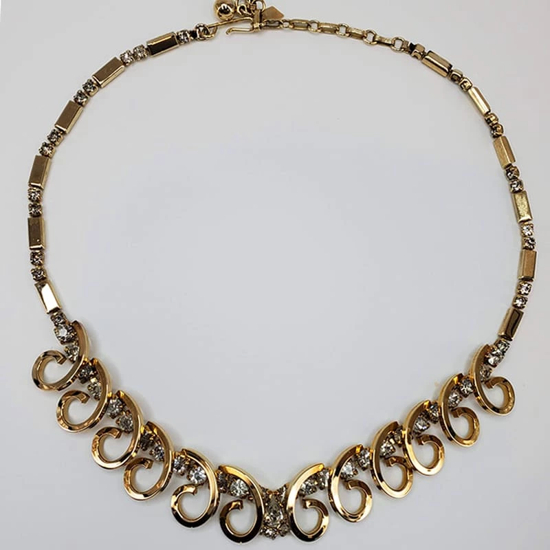 Gorgeous vintage swirl choker by Sarah Coventry. Has 28 small crystals, 26 larger crystals and 1 large drop-shaped crystal in the middle. Condition is good. Measures approx 8.5″L